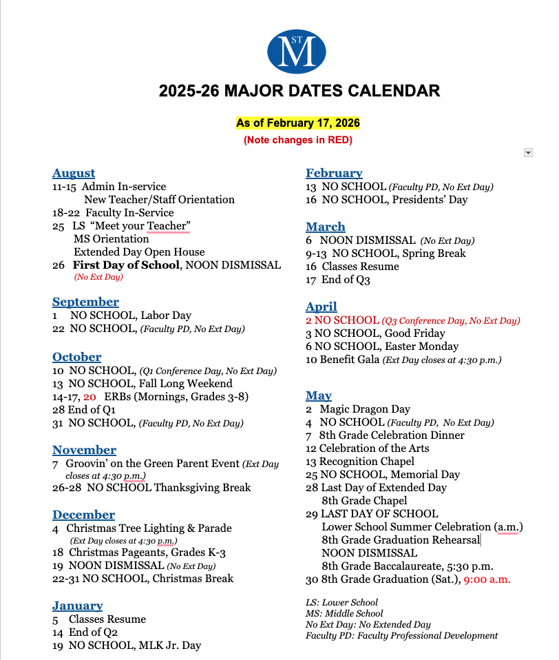 Printable 2025-2026 Academic Calendar- UPDATED Feb 17 — Note changes in RED